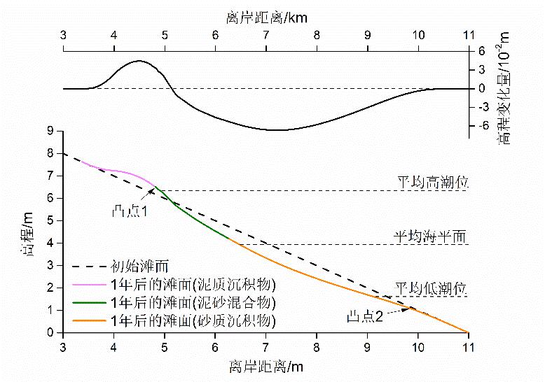 在正常天气往复潮流的作用下,初始的砂质滩面(泥质沉积物由开边界输入)经过1年的推移质搬运、悬移质的再悬浮与沉降后,自陆向海呈显著的分带性,依次为泥滩、泥砂混合滩和砂滩(图 4),其中泥滩位于平均高潮位以上,泥砂混合滩位于平均海平面与平均高潮位之间,砂滩位于平均海平面以下。该潮滩沉积分布的模拟结果与任美锷等[10]野外观测到的潮滩地貌和沉积分带性相一致。此外,原先平直的剖面经过潮流“上部淤积、下部冲刷”的改造呈现向“双凸”形态发展的趋势,这与江苏淤泥质海岸淤长型潮滩的实测剖面形态相类似[3,4,53],即剖面上存在两个坡度转折点,分别位于泥滩与泥砂混合滩、泥砂混合滩与粉砂细砂滩的交界处,坡度自陆向海呈“缓—陡—缓—陡”的变化。值得注意的是,这种双凸形剖面形态在堆积速率较快的潮滩也存在[4]。然而,从潮滩冲淤导致的高程变化量看,潮间带上部堆积速率小于4 cm/a,潮间带中下部侵蚀速率最大仅为6 cm/a,这100年时间尺度上的高程变化量相对于100~101 km量级的潮滩宽度很小,则潮滩剖面形态仍可近似认为是平直形。此外,尽管1年的模拟中潮滩沉积物向海净输出,但滩面上冲淤交界点在这一年中基本未发生迁移(图 7),这可能是如东海岸线基本稳定的原因之一。