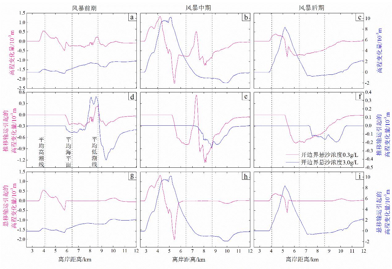 若将台风期间开边界悬沙浓度提高到3.0 g/L,潮滩的冲淤变化过程和分布格局与开边界悬沙浓度为0.30 g/L时存在明显差异。在风暴潮前期阶段,潮间带上部为薄层泥质堆积,潮间带中部和平均低潮线向海侧先后发生砂质沉积物冲刷和泥质沉积物堆积,平均低潮线向岸侧为泥砂混合堆积(图 5d,g)。在风暴潮中期阶段,悬移输运引起的泥质沉积物堆积向岸迁移至潮上带至潮间带中上部的广阔区域,最大堆积厚度出现在平均高潮线向海侧(图 5h),而潮间带下部表现为砂质沉积物冲刷,最大冲刷深度出现在平均低潮线附近(图 5e)。至风暴潮后期阶段,潮间带的冲淤格局与风暴潮中期阶段类似,但在潮下带向岸侧出现一定程度的泥质沉积物堆积(图 5i)。就整个风暴潮过程而言(图 5a,b,c),潮滩冲淤变化主要为潮上带、潮下带向岸侧和潮间带中上部的泥质沉积物堆积,潮间带下部平均低潮线向岸侧为砂质沉积物的“先淤后冲”而向海侧的砂质沉积物持续冲刷。