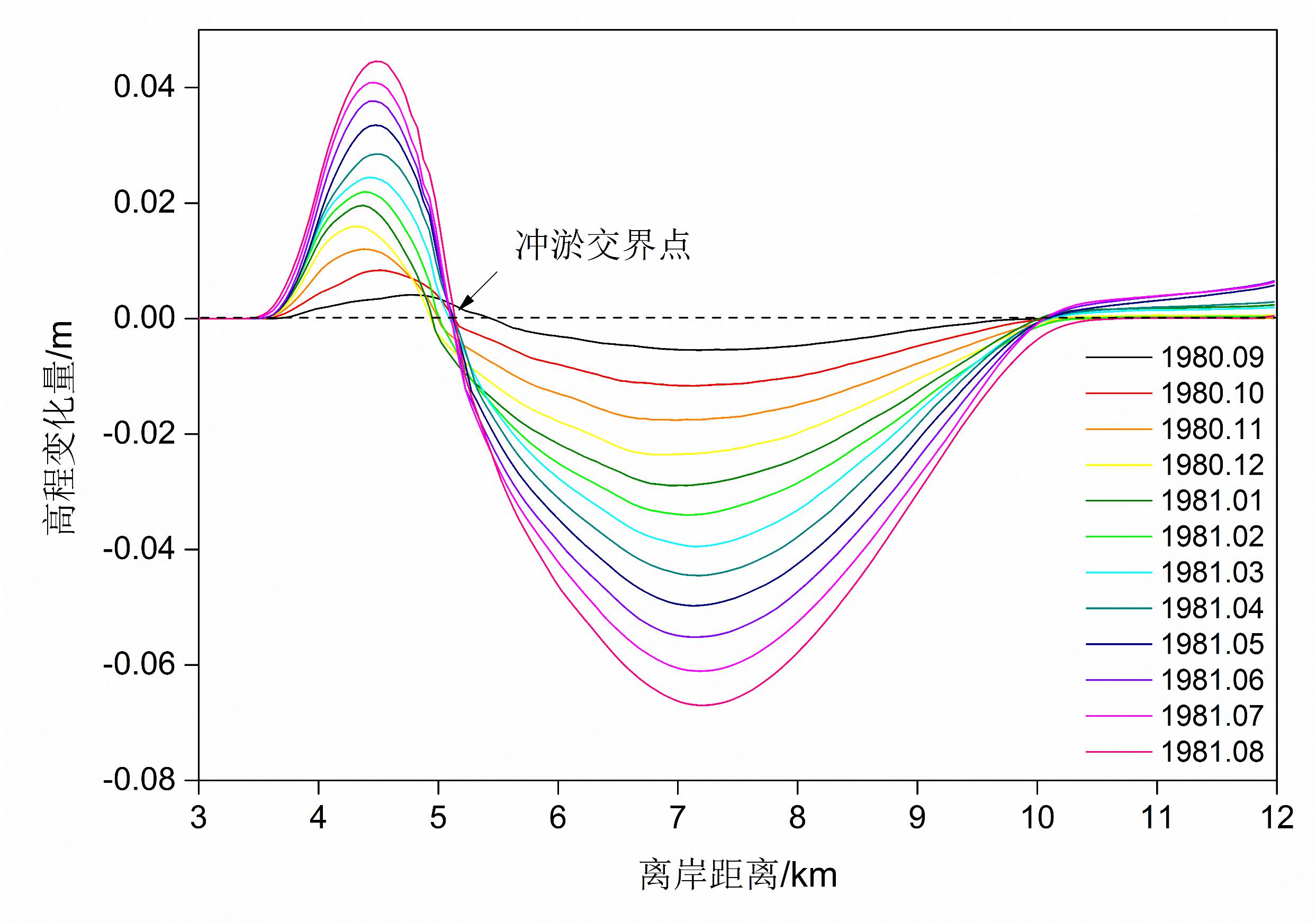 图 7 正常天气时1980年9月~1981年8月逐月的高程变化量Fig. 7 Bed elevation changes of tidal flats under fair weather conditions from Sep.1980 to Aug. 1981