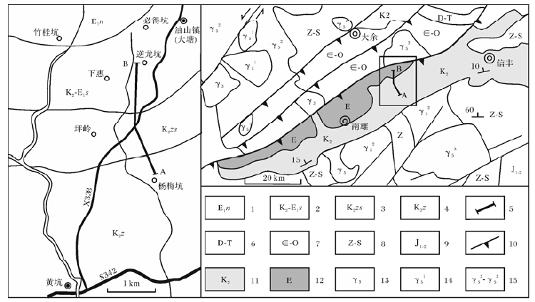 图 1 南雄盆地地质简图及大塘剖面交通位置图(据张显球等,2006;舒良树等,2004编绘[10, 12]) 1.浓山组;2.上湖组;3.浈水组;4.主田组;5.剖面;6.泥盆系—三叠系;7.寒武系—奥陶系;8.震旦系—志留系;9.下—中侏罗统;10.断层;11.上白垩统;12.古近系;13.加里东期花岗岩;14.印支期花岗岩;15.燕山早期—晚期花岗岩 Fig. 1 Simplified geological map of the Nanxiong Basin and location of the Datang cross-section (after Zhang Xianqiu,et al.,2006; Shu Liangshu,et al.,2004) 1. Nongshan Formation (Fm.); 2. Shanghu Fm.; 3. Zhenshui Fm.; 4. Zhutian Fm.; 5. cross-section; 6. Devonian-Triassic; 7. Cambrian-Ordovician; 8. Sinian-Silurian; 9. Middle-Lower Jurassic; 10. Fault; 11. Upper Cretaceous; 12. Paleogene; 13. Caledonian granite; 14. Indosinian granite; 15. Early-Late Yanshanian granite |