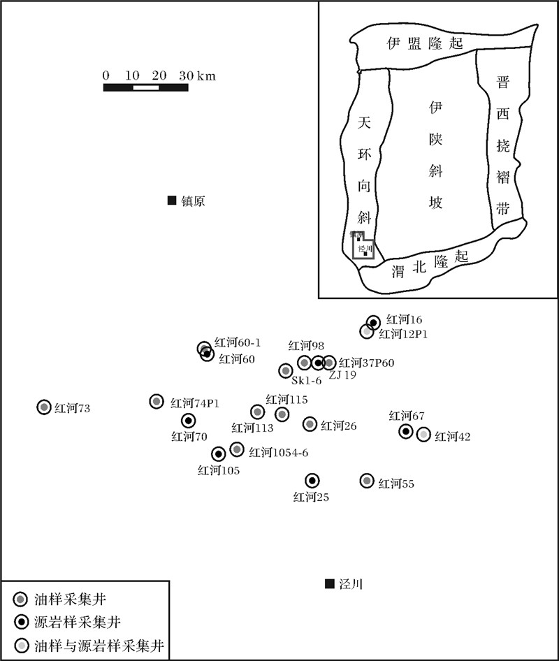 本文系统采集了鄂尔多斯盆地镇原—泾川地区13口井的原油和9口井的黑色泥、页岩(图 1),其中原油产层主要为上三叠统延长组,也有个别采自侏罗系,泥、页岩样品采自该区延长组长7、长8段。由于该区大部分油井油水同出,因此采集原油样品时,对油水进行了初步分离,并将样品及时运回实验室后在低温环境下保存。采集的烃源岩样品有机质丰度较高,泥岩有机碳含量均大于0.6%,油页岩有机碳含量大于10%,属于陆相中等及以上级别的烃源岩,具有该区典型延长组烃源岩的特征,样品具有较好的代表性。