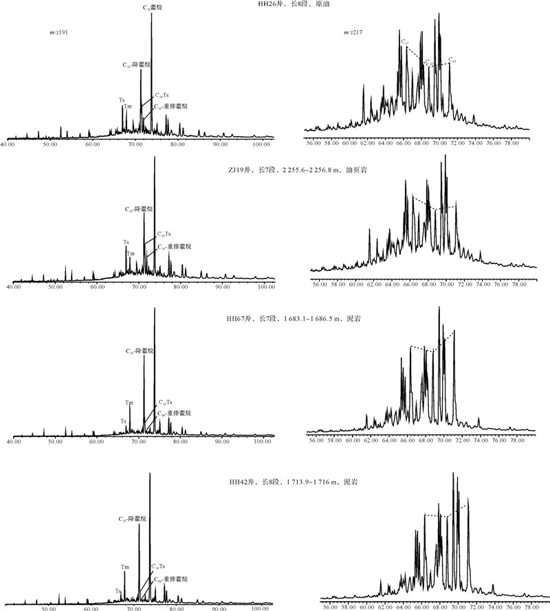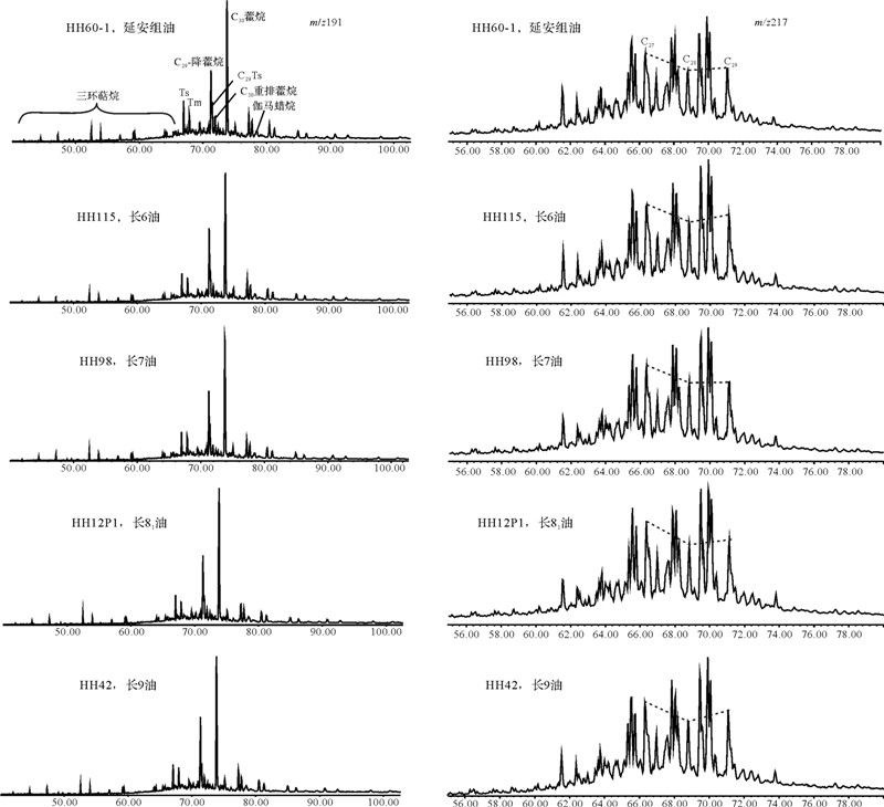 | 图 5 延安组长9原油甾、萜烷质量色谱图 Fig. 5 Crude oil sterols terpane mass chromatogram of Yanan Formation to Chang 9 in Yanchang Formation |