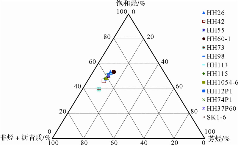 | 图 2 红河油田原油族组成特征三角图 Fig. 2 Triangular diagram of composition characteristics of crude oils in Honghe Oilfield |