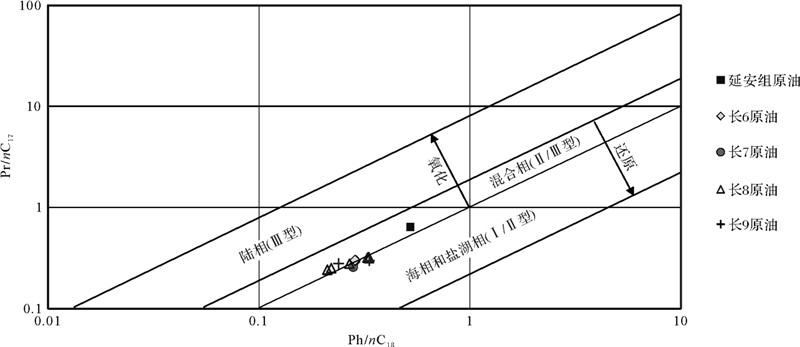| 图 4 原油中Pr/nC17与Ph/nC18值相关图 Fig. 4 Cross plots of Pr/nC17 vs. Ph/nC18 ratios of the crude oil samples |