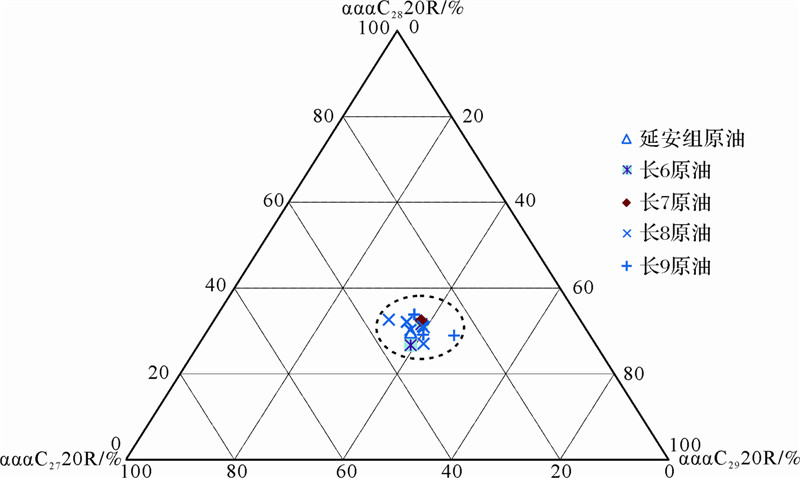 | 图 6 中生界各油层组原油规则甾烷相对组成 Fig. 6 Relative compositions of regular sterans of crude oils from the Mesozoic formation |