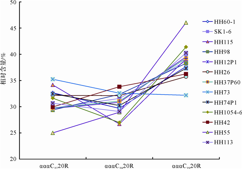 红河油田原油C27、C28和C29甾烷的相对含量分别为25.0%~35.2%、26.7%~ 33.8%和32.2%~46.0%(表 3),这些值在图 6中分布在一个较小的范围内,在含量折线图中多呈不对称的“V” 型,反“L”型(图 7)。除个别样品(HH73)以C27甾烷含量较高外,其他样品均以C29甾烷含量占优势,反映出中生界原油来自相同的油源,且陆生高等植物是本区烃源岩中有机质的主要贡献者,但在局部层段也有丰富的低等水生生物的母质供给。