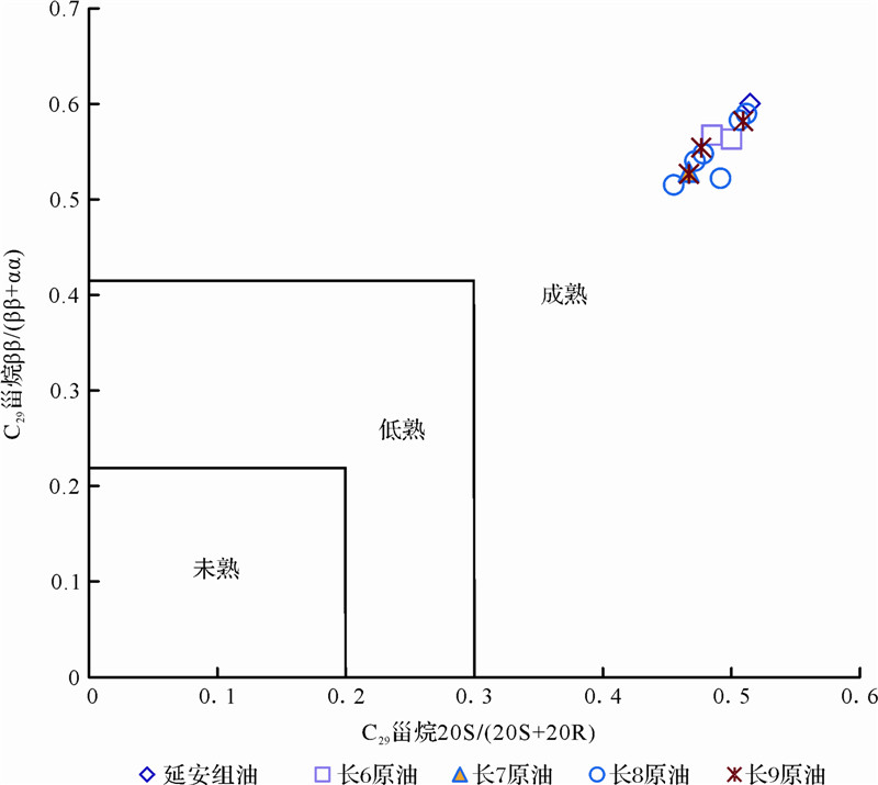 甾烷异构化参数αααC2920S/(20S+20R)和C29ββ/(ββ+αα)是很好的成熟度指标,二者均随着成熟度的增加而增大,反应平衡值分别为0.52~0.55和0.67~0.71[19],红河油田原油中C29甾烷20S/(20S+20R)值分布范围为0.46~0.51,C29ββ/(ββ+αα)值 分布范围为0.52~0.60(表 3),在图 8(图版引自文献20)中数据点均落在成熟区域,且分布较为集中,说明红河油田不同油层组原油成熟度相近,均属于成熟原油。另外,原油中重排甾烷/规则甾烷值也可以用来评价原油的成熟度[20,21,22],红河油田原油中重排甾烷/规则甾烷值为0.08~0.22,C29重排甾烷20S/(20S+20R)值为0.38~0.71(表 3),这些指标均反映了原油为成熟原油。