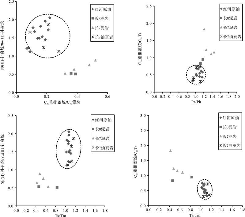 而长7和长8泥岩的C30重排藿烷含量更低,几乎不含C29Ts,且Ts含量明显低于Tm。同时,原油和长7油页岩与长7和长8泥岩的C27、C28、C29甾烷分布特征明显不同,表现为原油和油页岩的C27甾烷丰度高,而长7和长8泥岩的C29甾烷丰度明显偏高(图 10)。可见,红河油田中生界原油与长7底部的张家滩油页岩具有亲缘关系,推测原油主要来源于长7油页岩。这与邓南涛等[24]认为鄂南地区长7油页岩为该区油源最大贡献者的认识相一致。