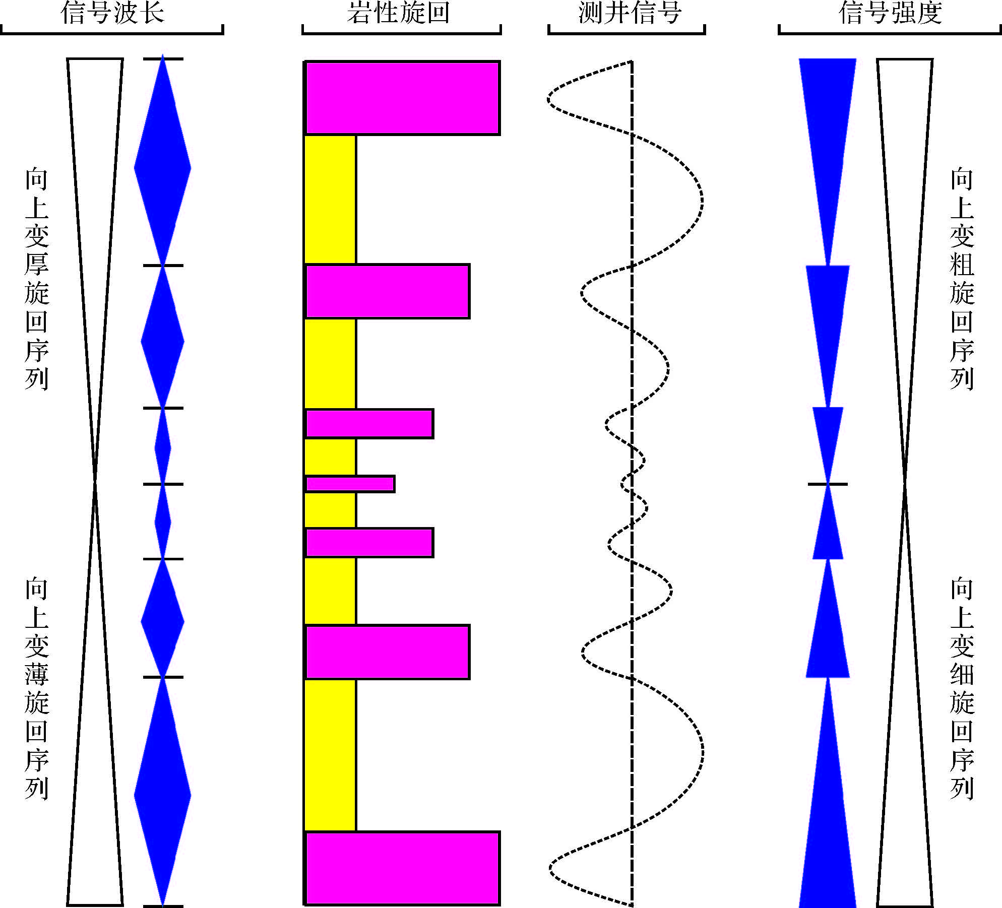 | 图 1 地层记录中沉积旋回信号幅度和波长变化形式示意图 Fig. 1 Amplitude and wavelength directional changes of sedimentary cycle signals in stratigraphic records |
