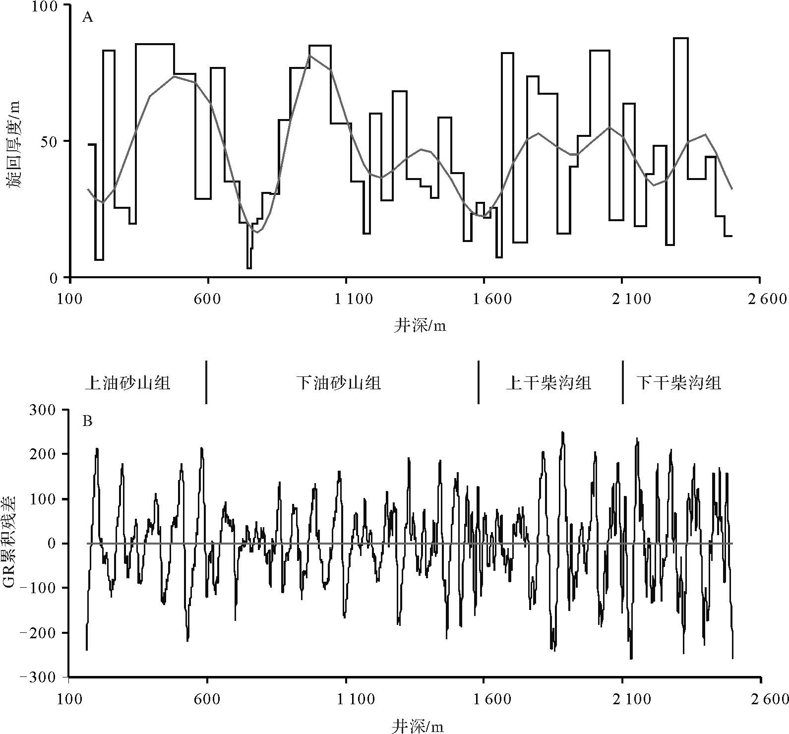 进一步观察图 8可以发现,上油砂山组与下油砂山组以及下油砂砂组与上干柴沟组旋回层序界面与岩石地层界面在同一个深度,井深分别为599 m和1 591 m,而上干柴沟组与下干柴沟组则位于一个长周期旋回与短周期旋回界面交界面处,如果按旋回层序进行分层,则二者地层深度应从井深2 100 m下移至2 190 m。同时,仙3井三个地层界面,在累积残差曲线图上位于负半波与正半波曲线转换点的位置,而这个界面深度恰是向上变粗的沉积序列向向上变细的沉积序列过渡的部位,可能反映了湖平面从下降到上升的沉积过程。