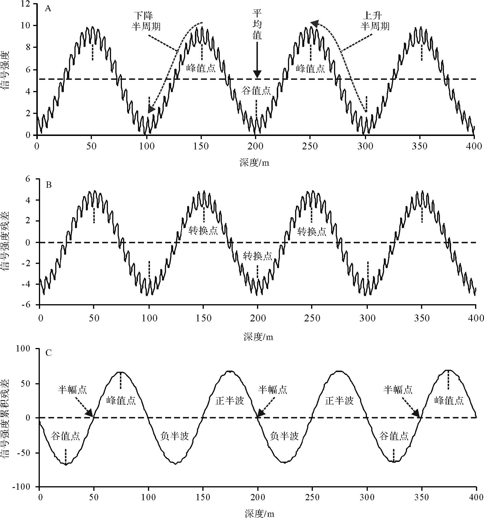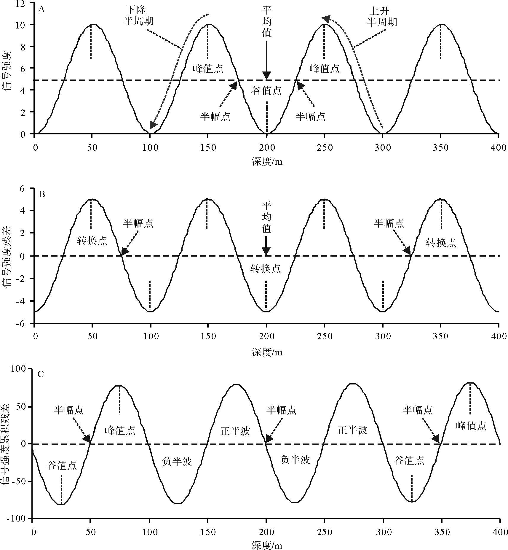 图 2B是根据原始信号强度与平均值之差计算的信号强度偏差曲线,它与图 1A中原始正弦波曲线波形一致,但其平均值通过正弦波曲线半幅点位置。图 2C是测井信号强度的累积残差曲线,它是将测井信号的强度从上到下顺次累加重构的一条曲线,它与原始正弦曲线存在180°的相位差,这时原始正弦波曲线的上升半周期和下降半周期转换为正半波和负半波信号,而正半波与负半波曲线半幅点深度对应图 1A中原始正弦波曲线峰值点和谷值点的位置。在测井旋回曲线分析时,我们可以利用累积残差曲线这一特性,根据平均值与累积残差曲线交点的深度,标定旋回层序界面的位置。