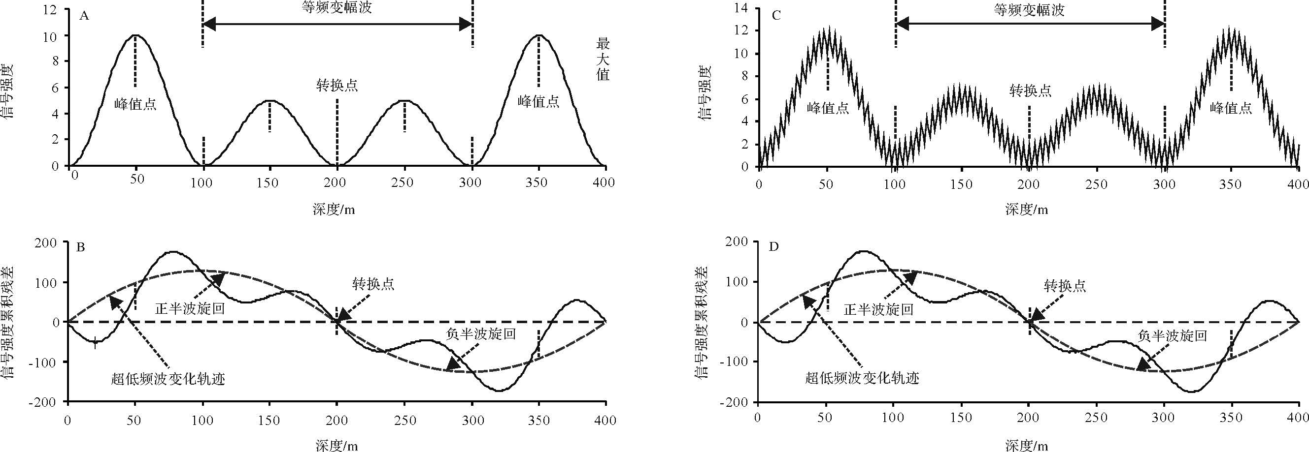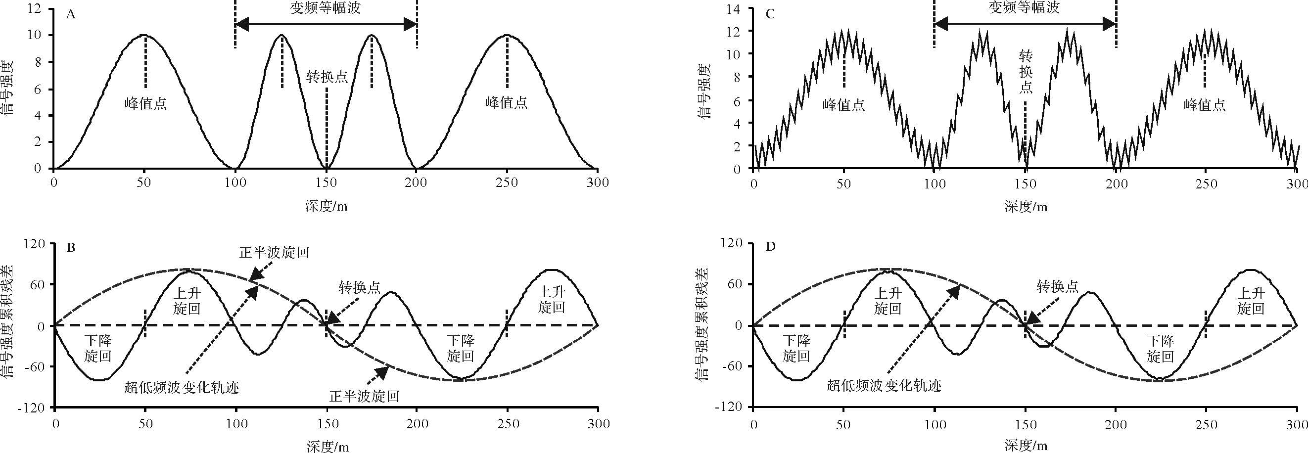 图 5A是一个单旋回正弦波信号,设定旋回信号的变化幅度相等,最大振幅为10,但波长在深度域变化,中间二个高频正弦波波长为50 m,两侧低频波波长为100 m。图 5C是一个复合正弦波,低频正弦波波长和幅度变化与图 5A相同,其上叠加波长为5 m、幅度变化区间介于0~2 m的高频正弦波。对比观察图 5B和图 5D信号强度累积残差曲线,可以发现它与变幅波相似,也会产生一个超低频波信号,同时深度域短周期正弦波信号振幅明显减小,叠加的高频正弦波信号消失。