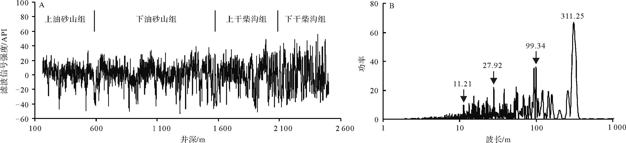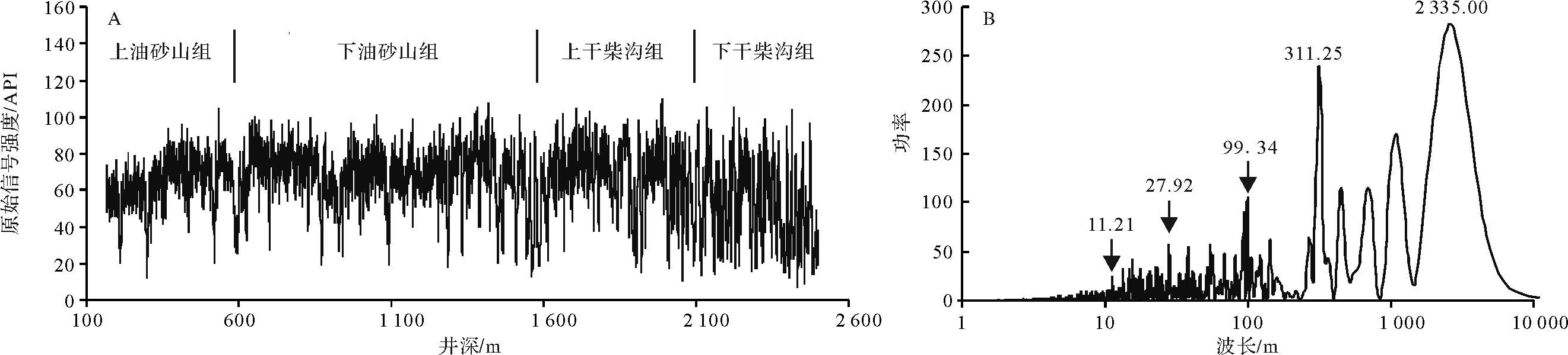 | 图 6 柴达木盆地仙3井GR原始测井曲线(A)及频谱分析图(B) Fig. 6 Spectral analysis diagrams of original GR data from the Well Xian 3 of Qaidam Basin |