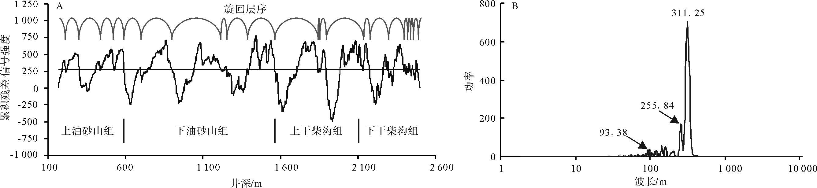 图 8A是采用滤波信号强度计算的仙3井累积残差曲线,根据图形判读和计数,四个组级地层单元共识别21个沉积旋回以及2个半旋回,其中下油砂砂组可划分为3个旋回层序,上干柴沟组可识别出5个旋回层序,且旋回周期或波长差别甚大。图 8B是仙3井累积残差曲线的频谱分析结果,它的低频旋回波长为311.25 m和255.84 m,可检测的最小旋回波 长为93.38 m,与图 7B滤波曲线频谱分析图比较,累积残差曲线中高频旋回消失,它仅显示了低频旋回周期,这验证了累积残差曲线记录的是一个测井区间长周期旋回的结论。