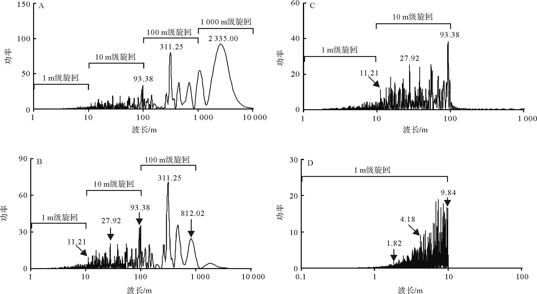 图 9A中仙3井GR测井数据的频谱分析图中解析的低频波的旋回波长为2 335 m,最小的旋回波长为0.25 m,根据旋回波长的大小可分四级。图 9B、图 9C和图 9D分别通过高通滤波分解的100 m、10 m、1 m级的旋回频谱分析图,对比观察特征峰的大小和位置,可以了解不同级次旋回波长的大小变化形式。例如图 9B 中100 m级旋回的主旋回波长为311.25 m,10 m级旋回的计有波长从93.38 m到11.21 m等多个优势频谱峰,而1 m级旋回则以波长9.56 m特征峰显示最明显。