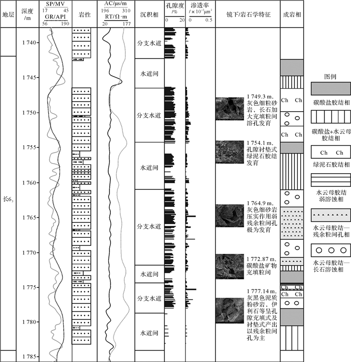 图 5 板桥—合水地区长63储层单井成岩相分析 Fig. 5 Diagenetic facies analysis of Single well of Chang 63 reservoir in Banqiao-Heshui area |