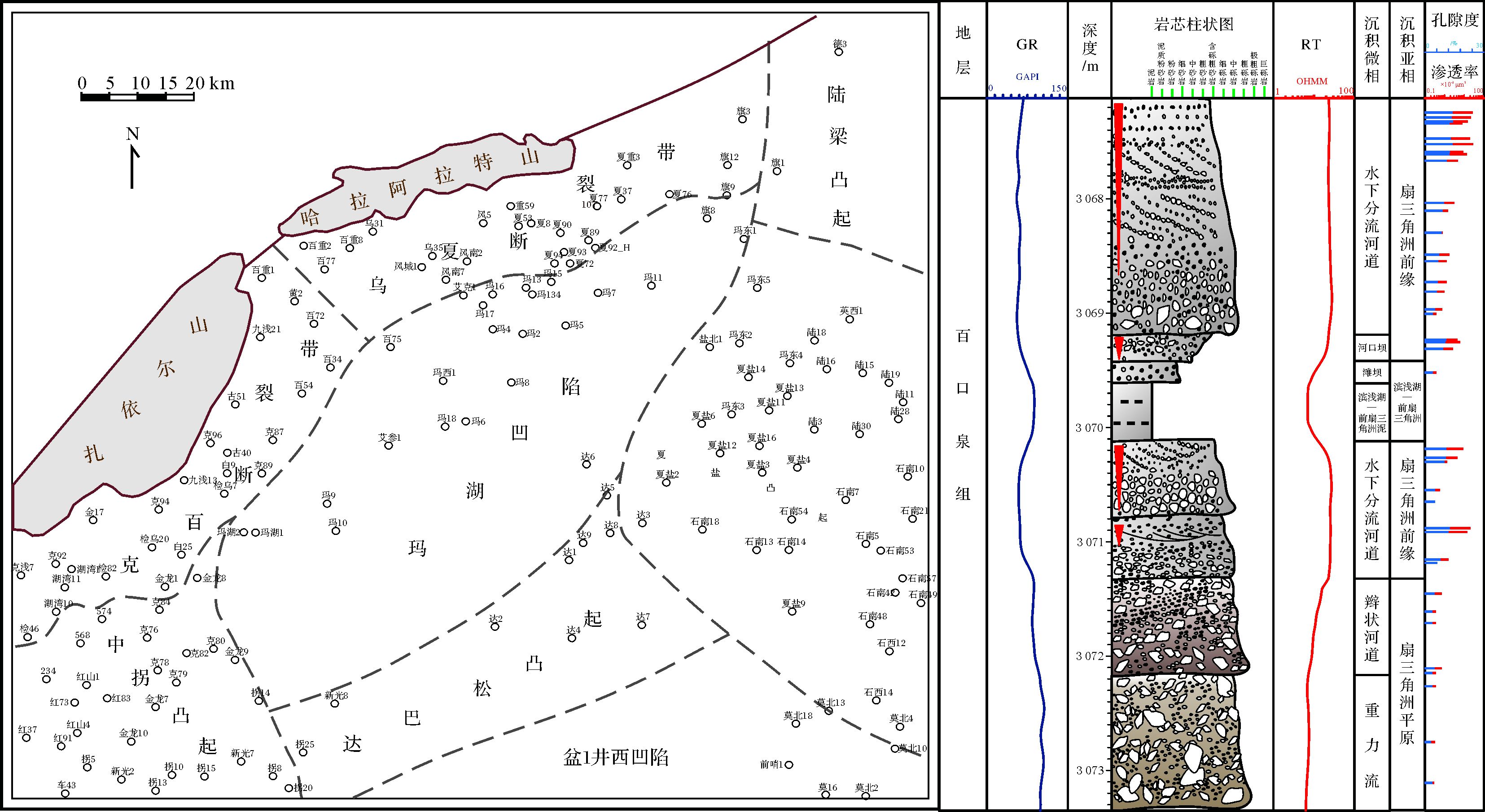 研究区三叠系百口泉组是新疆油田近5年来勘探评价的主战场,2012—2014年已累计提交三级石油地质储量近2亿吨。研究表明,在整体低孔低渗背景下,该套砂砾岩体内部表现为较强非均质性,既可作为储层也可作为致密封挡层。高产(日产液量>10 m3/d)高效储层的孔隙度可达10%~15%;渗透率1~30×10-3 μm2;中低产(日产液量>1~10 m3/d)中低效储层孔隙度约7%~10%,渗透率约0.2~1×10-3 μm2;致密封挡层孔隙度<5%;渗透率<0.1×10-3 μm2。