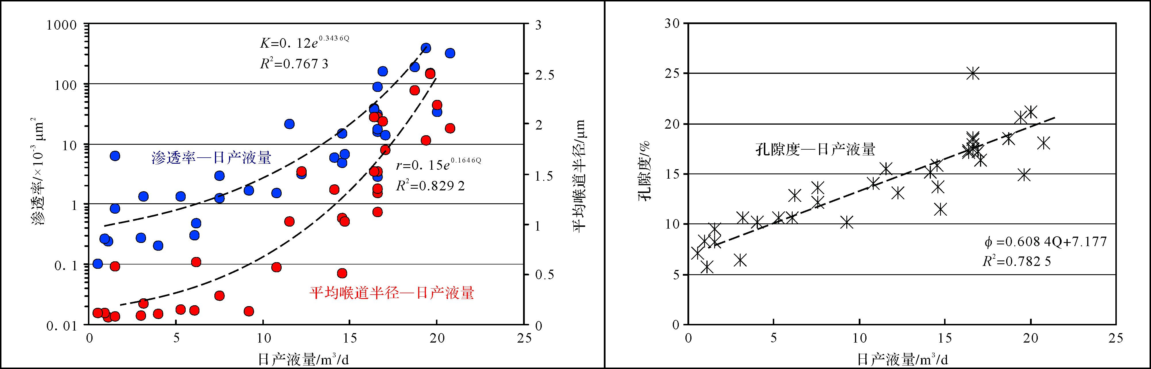 | 图 2 日产液量与渗透率/平均喉道半径;孔隙度—渗透率关系交汇图 限定条件:(1)相带:扇三角洲前缘水下分流河道;(2)孔隙型储层;(3)储层厚度8~10 m Fig. 2 Relation map of per-liquid output-permeability/mean throat radius and porosity-permeability |