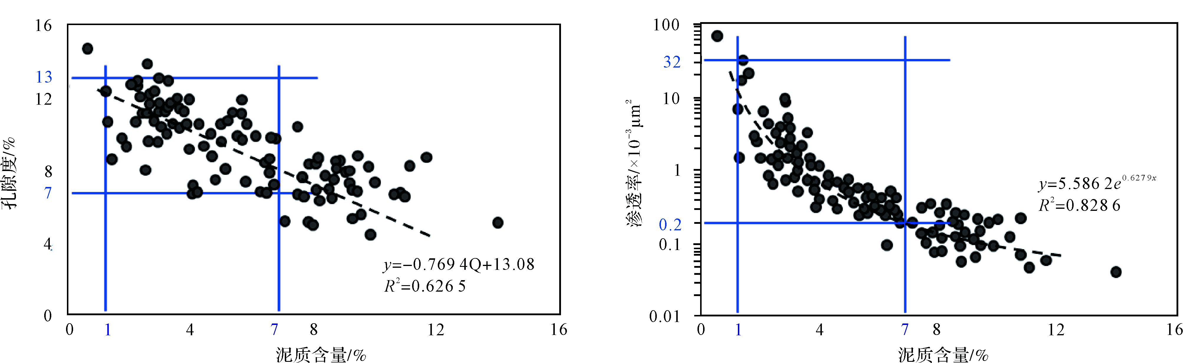 研究表明,研究区砂砾岩储层储集性能与沉积作用(主要为水动力条件;主要评价参数:泥质含量)、成岩作用(压实—胶结作用)关系密切。