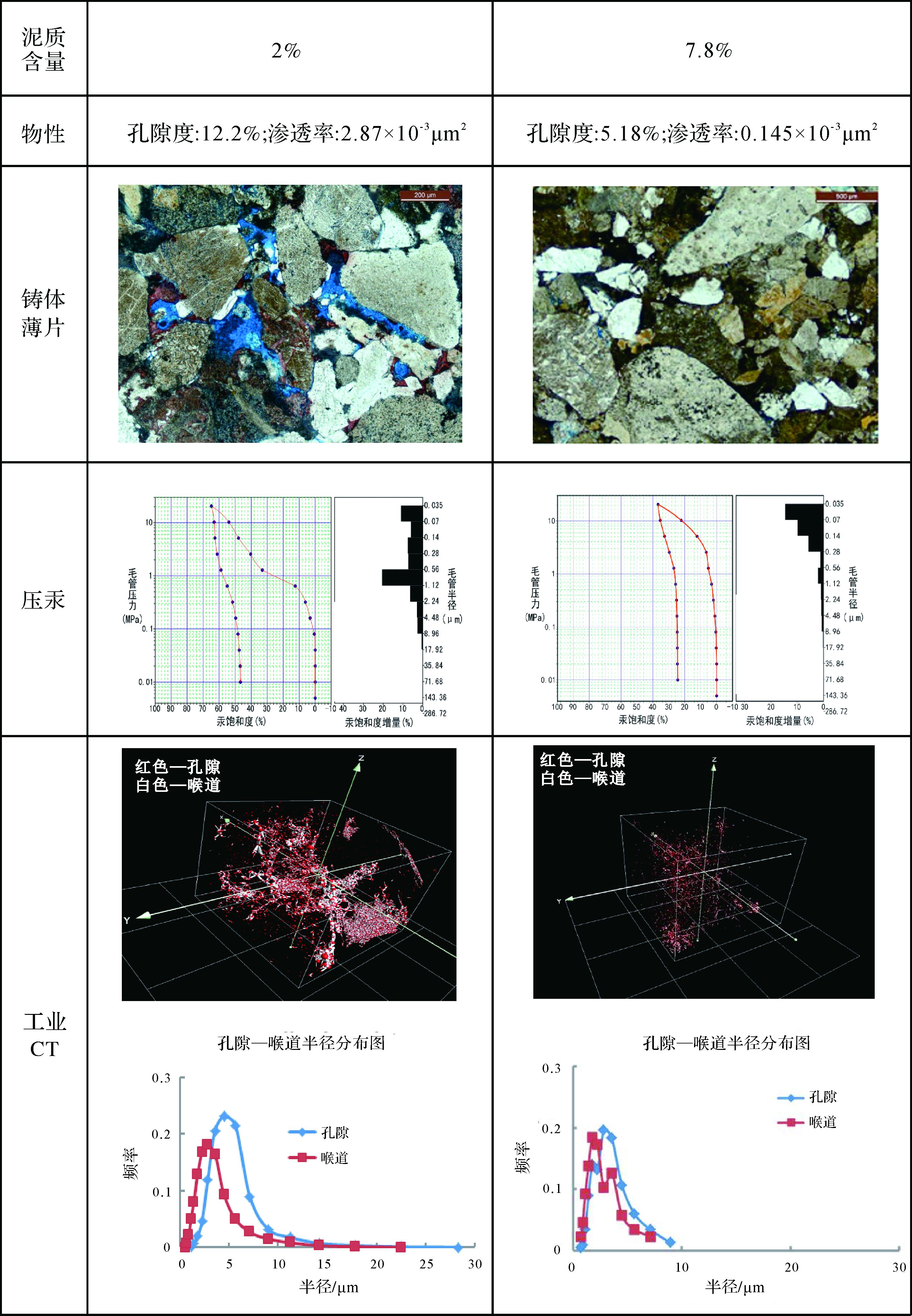 样品 泥质含量 | 工业CT | 压汞 | |||||||||