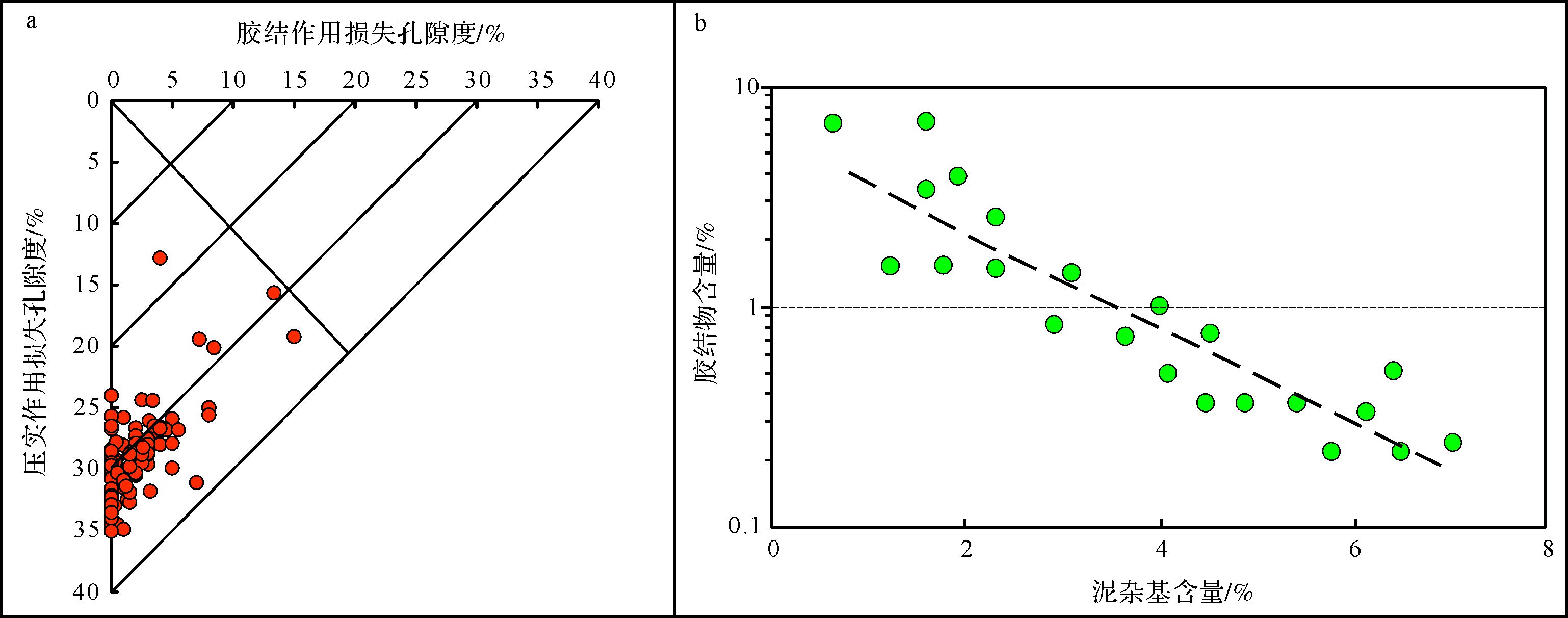 | 图 5 百口泉组压实—胶结减孔评价(a)及泥质含量—胶结物含量关系(b) Fig. 5 Cut-porosity valuation of compaction-cementation(a) and mud-cement content (b) of Baikouquan Formation |