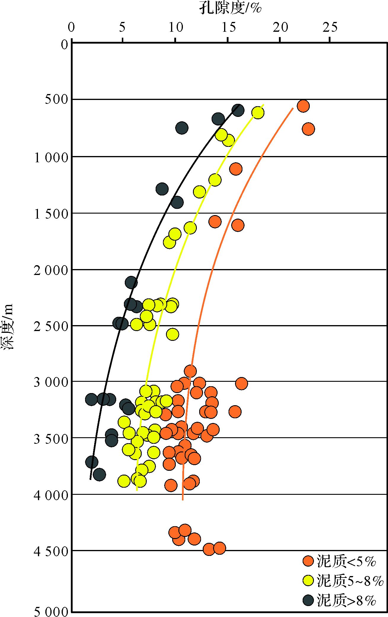 | 图 6 不同泥质含量砂砾岩压实减孔效应对比图 Fig. 6 Cut-porosity valuation of compaction in diverse mud content sand-gravel reservoir |