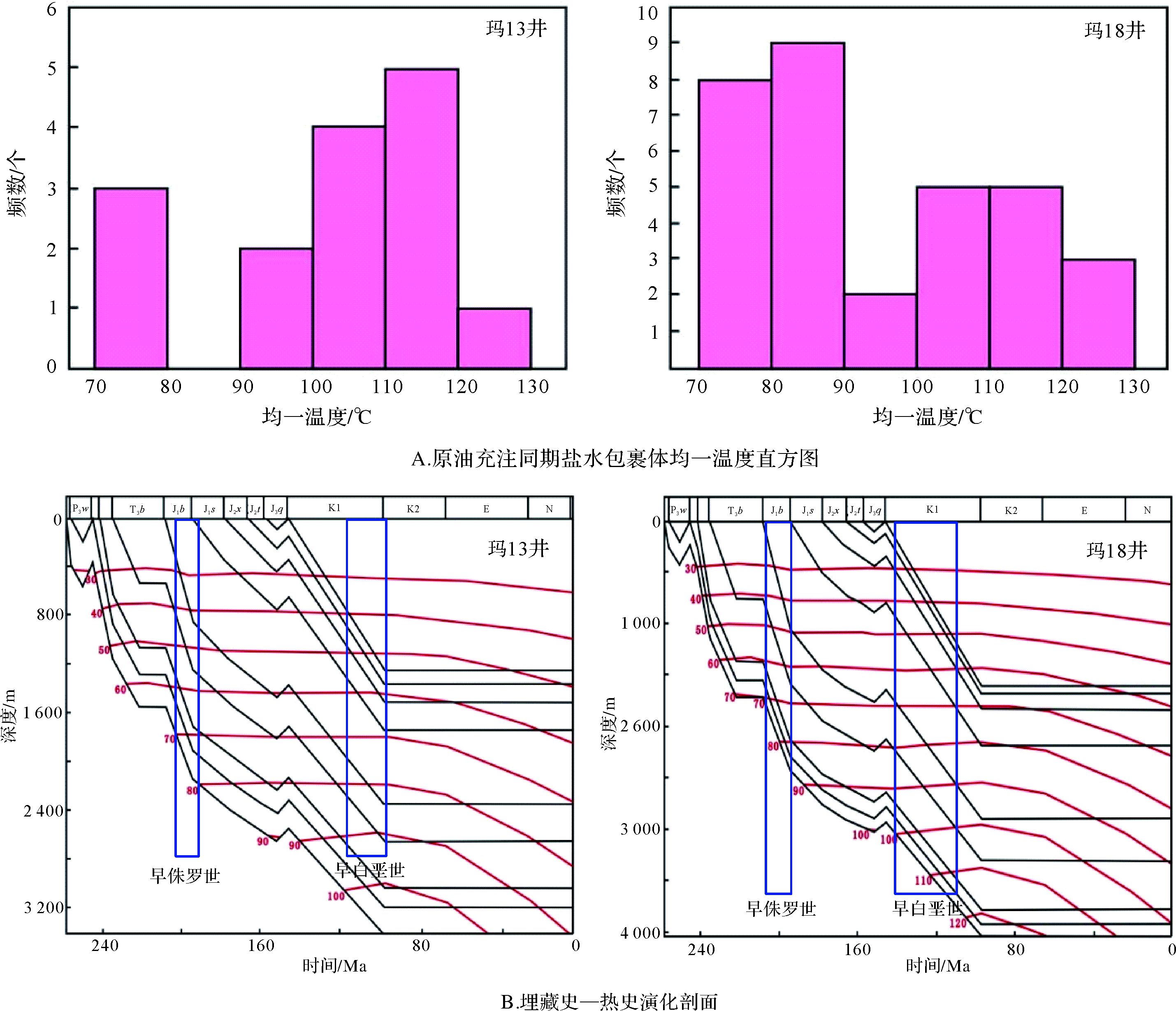 | 图 7 包裹体测温—埋藏史/热史综合确定油气充注期次图 Fig. 7 Oil-gas injection time confirmed by fluid-inclusion temperature-bury/heat history curve |