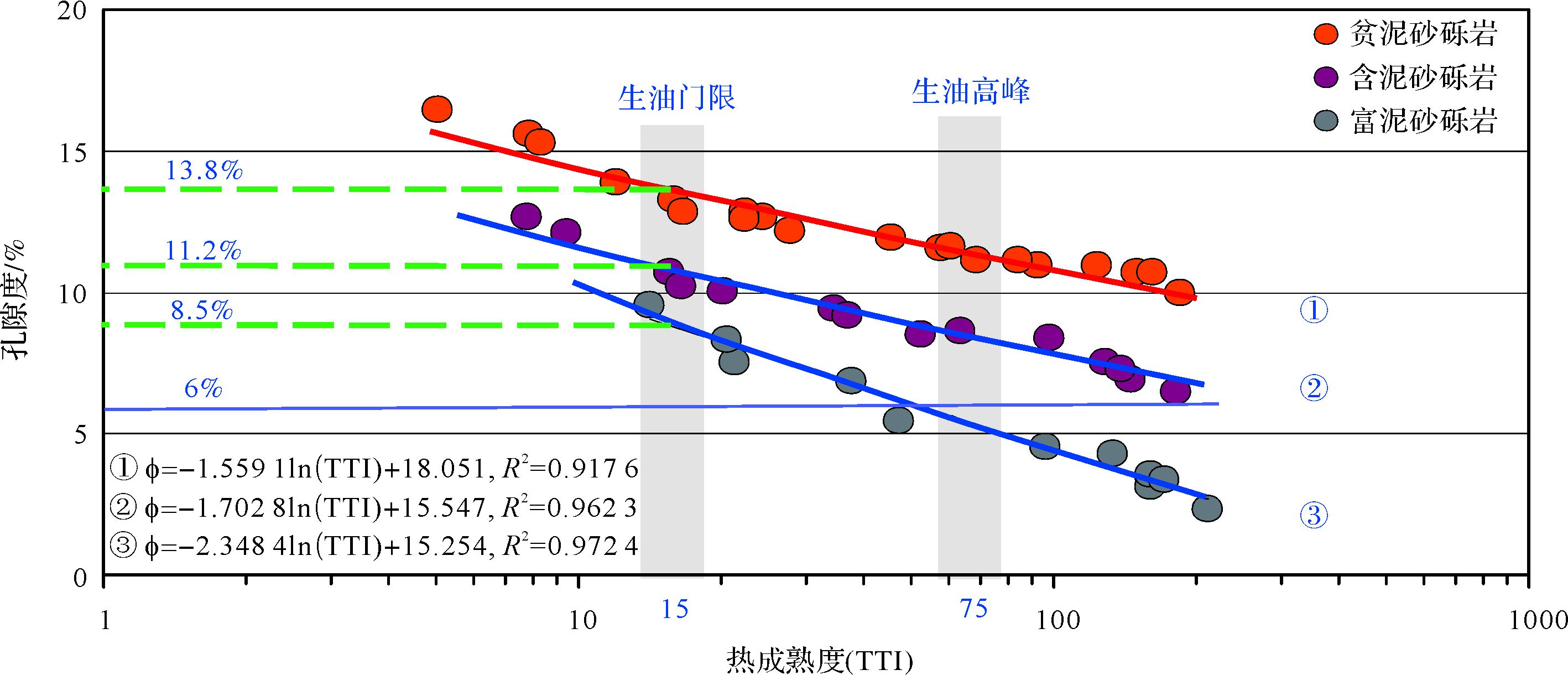 前人研究成果[13, 14]及玛13井、玛18井百口泉组砂砾岩盐水包裹体测温—埋藏史/热史演化数据表明,该区存在两期盐水包裹体,其均一温度分别为70℃~90℃和100℃~120℃,它们指示了两期油气充注,分别对应早侏罗世、早白垩世(图 7),即玛湖凹陷西斜坡区三叠系百口泉组经历了早侏罗世和早白垩世两期油气充注成藏过程。对照百口泉组砂砾岩储层孔隙度—热成熟度(TTI)交汇结果(图 8),百口泉组贫泥砂砾岩、含泥砂砾岩、富泥砂砾岩三种岩相储层在第一期油气充注期(早侏罗世,TTI=15)平均孔隙度分别维持在13.8%、11.2%、8.5%,均可作为有效储层,但此时期下伏烃源岩刚刚进入生油门限,生排烃量有限,有限的油气沿优势通道向低势区运移,主要聚集在物性较优的贫泥砂砾岩岩相、含泥砂砾岩岩相储层中,富泥砂砾岩岩相储油量非常有限(岩芯油气显示数据也表明,富泥砂砾岩岩相岩芯基本无油气显示);至第二期油气充注期(早白垩世,TTI=75),下伏烃源岩进入生排烃高峰期,此时期贫泥砂砾岩、含泥砂砾岩相储层的孔隙度分别维持在12%、8%,仍为主要的储油层,而富泥砂砾岩相储层平均孔隙度已小于6%,储集性能明显变差,形成研究区主要的致密封挡带。