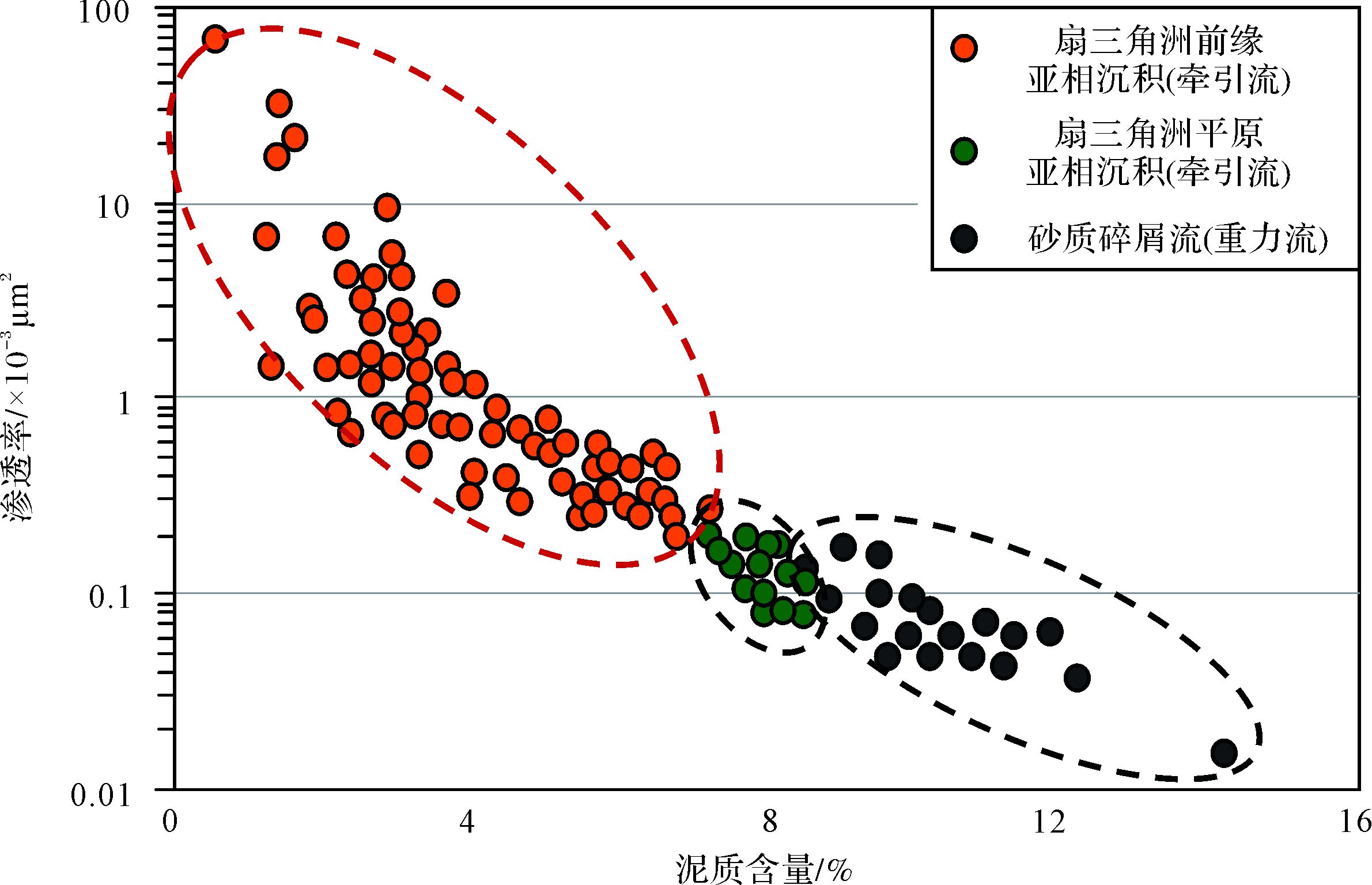 3 岩相类型及油气充注期储集性能差异 3.1 岩相类型在明确泥质含量为影响本区砂砾岩储层储集性能关键因素基础上,以泥质含量为主分类参数,划分出贫泥砂砾岩、含泥砂砾岩、富泥砂砾岩三种岩相,并 结合泥质含量—孔隙度/渗透率交汇图版(图 3)、该区油层孔隙度下限7.4%及日产液量5 m3/d(参考研究区工业油流标准)对应的渗透率下限0.8×10-3 μm2(图 2),综合厘定上述三类岩相的量化区间:贫泥砂砾岩(泥质含量<5%)、含泥砂砾岩(泥质含量5%~8%)、富泥砂砾岩(泥质含量>8%)。