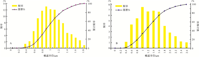 近年来随着非常规油气勘探的快速发展,国外通过喉道的各种表征参数开展了大量的非常规储层评价、成藏机理的研究与讨论,极大地推动了致密气勘探以及理论与技术发展[21-26]。事实证明,以喉道为评价参数的致密砂岩储层评价方法是一种有效且科学的方法。然而国内还未见有利用喉道参数进行储层评价的相关报道。本文尝试以喉道半径为参数,建立库车坳陷迪北地区致密砂岩气储层评价的方法与标准,并以此评价该区致密砂岩气储层的质量。