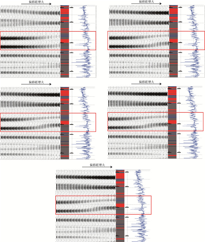 模型说明:大套泥岩之中发育厚度30 m砂体,利用流体替换进行不同含气饱和度下(0%~30%~50%~70%~100%)的纵波阻抗、横波阻抗、纵横波速度比、密度等曲线的正演,进一步得到不同饱和度下的地震正演道集,分析不同饱和度情况下的地震响应(图 5)。可以看出,当地层由饱含水到30%含气时,储层的纵波阻抗明显降低,造成地震振幅随偏移距变化明显,由Ⅰ类AVO变为Ⅱ类AVO;但当地层由30%~50%~70%~100%逐渐变化时,地震振幅变化较弱,因此在孔隙度较低的情况下,地震资料对地层是否含气较为敏感,但对含气饱和度的变化不敏感,利用地震资料进行含气饱和度预测(含气性好坏)存在一定的风险。