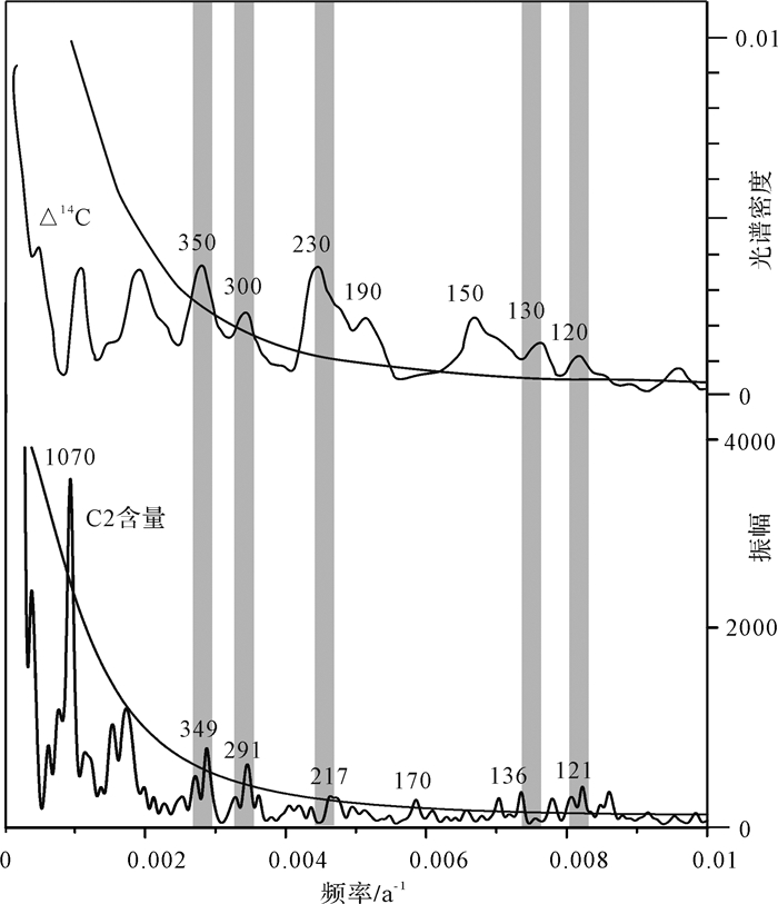 本文将16 ka B.P.以来大湖C2百分含量与大气剩余Δ14C值丰度值做了对比,并且运用Schulza和Mudelsee共同设计的周期分析软件(Redfit38)对K02孔的C2含量进行了周期分析。如图 9所示,在90%的置信度检验下,检验出了1 070 a这一个千年尺度周期和若干个百年尺度周期(349 a,291 a,217 a,170 a,136 a,128 a,121 a和116 a);其中所检验出来的349 a、291 a、217 a、136 a和121 a的周期在大气剩余Δ14C的周期中也有明显的对应,而且1 070 a、349 a和291 a的周期与Lim et al.[41]在对韩国济州岛湖泊沉积物的研究所得到的1 056 a、370 a和289 a的太阳活动周期非常接近,349 a的周期与Sagawa[42]和Liu et al.[43]所研究的350 a的太阳活动周期对应较好;Cosford et al.[44]通过金滩湾洞石笋δ18O所得到的121 a周期和Zhang et al.[45]通过石笋研究所得到的117 a、138 a的太阳活动周期记录,也与本研究所得到的136~116 a的周期记录相吻合。