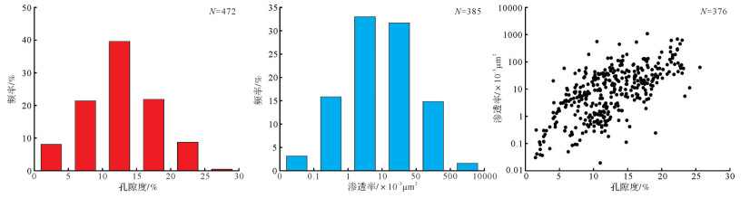 通过对东营凹陷永1块沙四下亚段砂砾岩8口探井近500个实测物性资料统计,孔隙度在0~15%的样品数占总数67%,渗透率在(1~50)×10-3 µm2的样品数占总数63%,孔—渗相关性较好(图 3)。孔隙度分布在1.5%~28.8%,平均为12.6%,渗透率分布在(0.019~1 072)×10-3 µm2,平均为38.4×10-3 µm2,储层呈现明显的低孔、低渗特低渗特征。