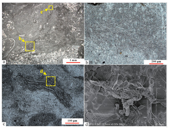 图 7 均一石生物丘内部的葛万菌(Girvanella) (a)构成均一石生物丘的致密泥晶内部的葛万菌菌落;(b)部分呈相互缠绕的丝状体聚集成的葛万菌;(c)不规则条带状分布的葛万菌,表现为不分节和不分叉的特点;(d)扫描电镜下可见丝状微生物化石 Fig.7 Images of fundamental features of Girvanella within leiolitic bioherm (a) a colony of Girvanella within dense micrites making up the leiolitic bioherm; (b) interfilamentous twisting making up Girvanella; (c) irregular banded distribution of Girvanella, which appears with unsegmented and unbranched features; and (d) ultra micro-fabric of Girvanella within the leiolitic bioherm |