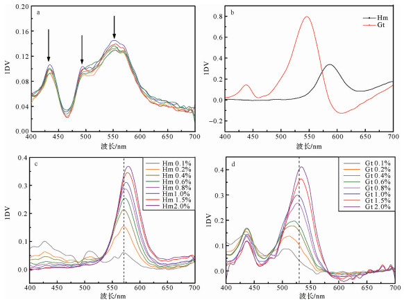 自然基体中加入标准矿物(0.1%~2.0%)后,其一阶导数曲线变化有两点:一是特征峰峰值随加入的标准矿物含量的增加而增大,二是特征峰峰位向长波方向偏移。其中,赤铁矿序列的一阶导数谱峰位从570 nm增长到580 nm,峰高从0.052增加到0.322。针铁矿序列的一阶导数谱峰位从510 nm增长到535 nm,峰高从0.101增加到0.411(图 3c,d)。