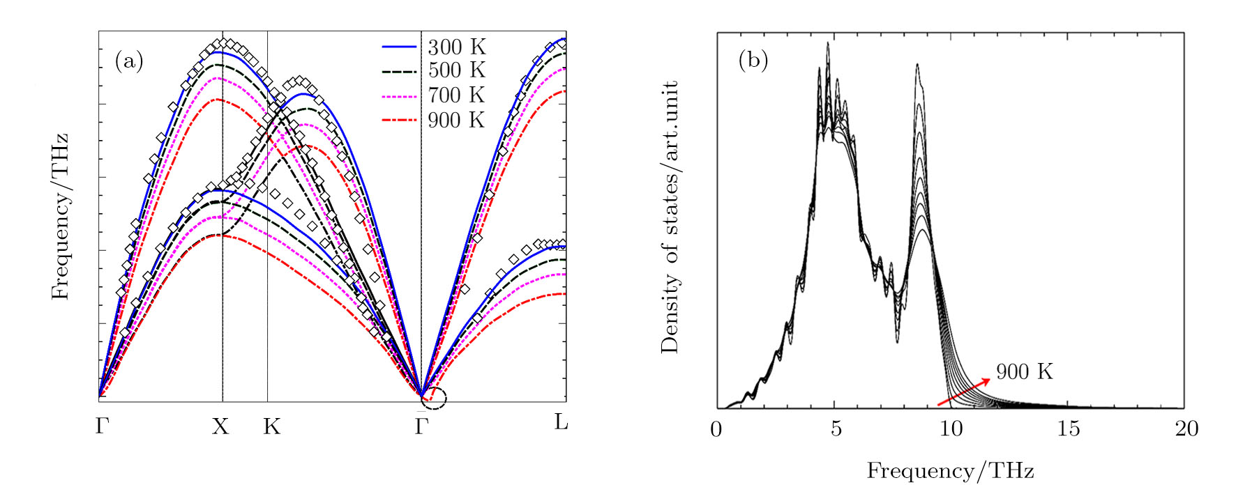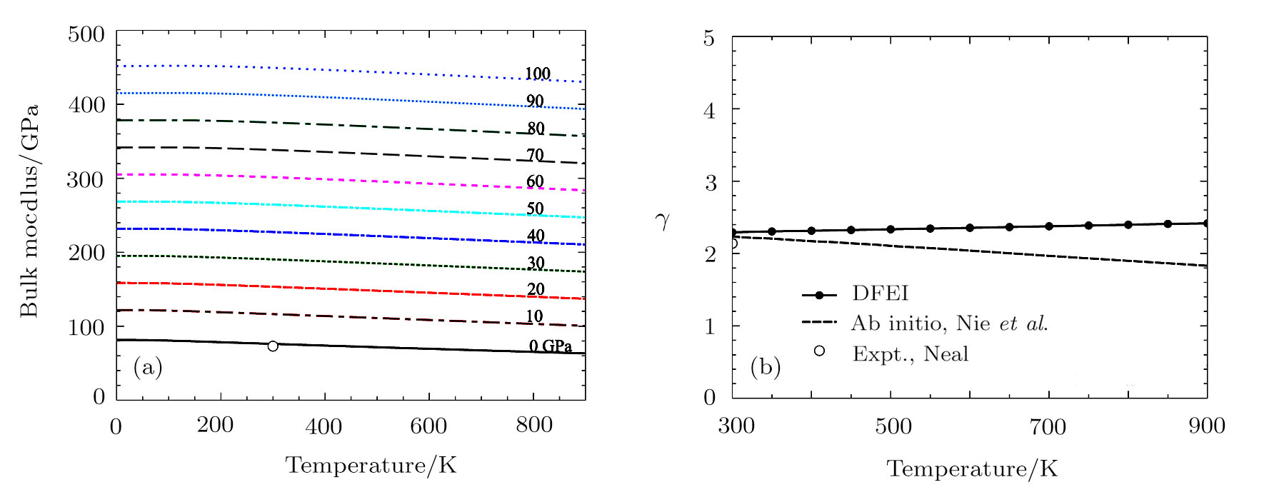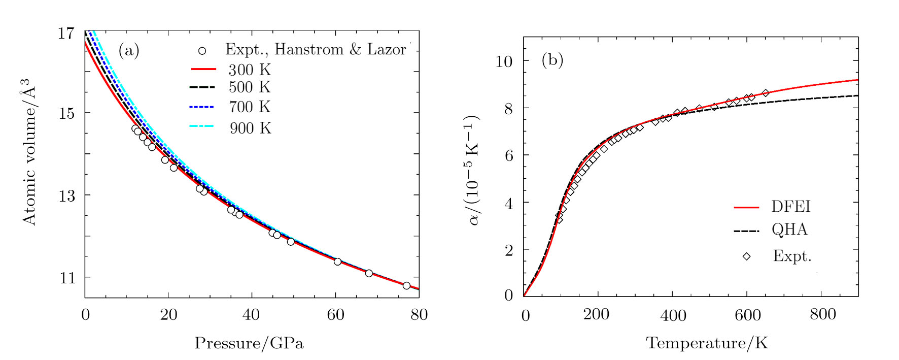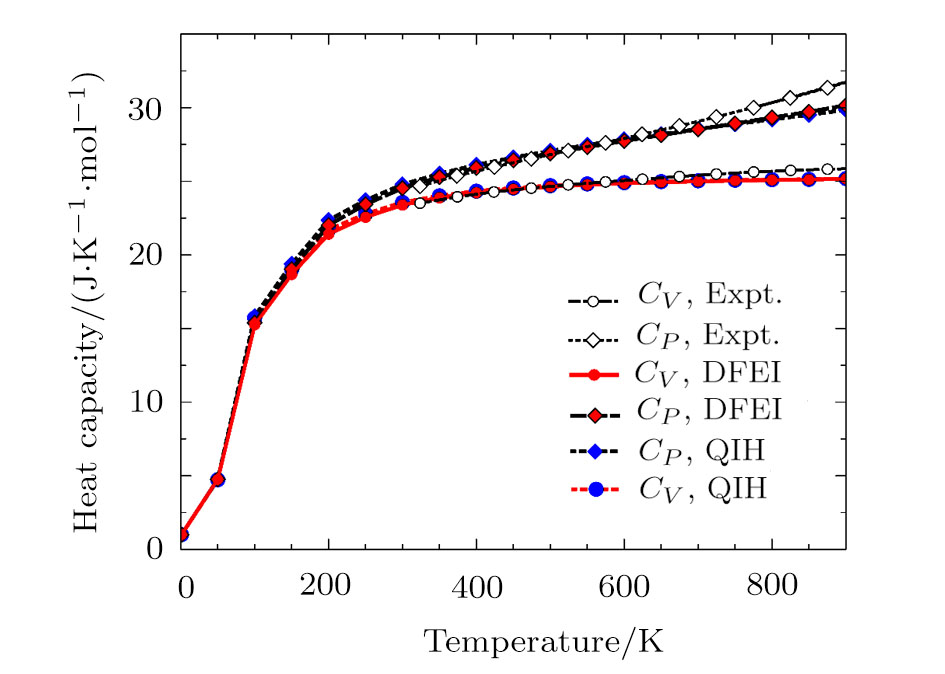 Usually, the quasi-harmonic approximation (QHA) was used to calculate the temperature effects and it only takes account into the volume dependence of phonon frequencies of lattice vibrations. However, in real materials the phonon frequencies depend largely on temperature, especially in the highly anharmonic solids or at the temperature close to melting. This is because that the QHA omits part of anharmonicity and is only accurate when temperature below Debye temperature.[4–6] In order to overcome these difficulties of QHA, several anharmonic free energy calculation techniques have been developed, such as the thermodynamic integration technique[7–8] and the self-consistent ab initio lattice dynamics (SCAILD) method.[9–10]