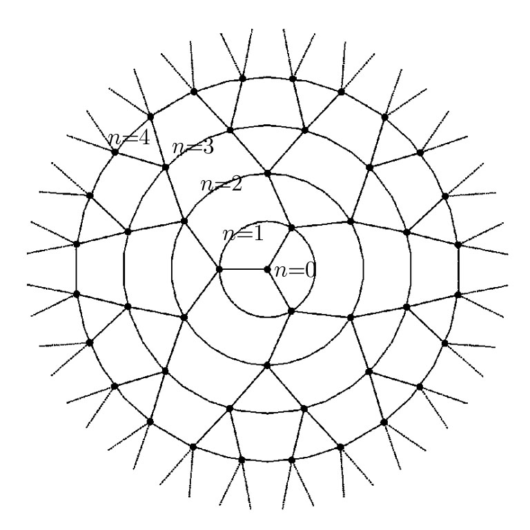 The BL of coordination number q = 3. The filled circles denote the spins and the dotted circles represent the shells of the BL.