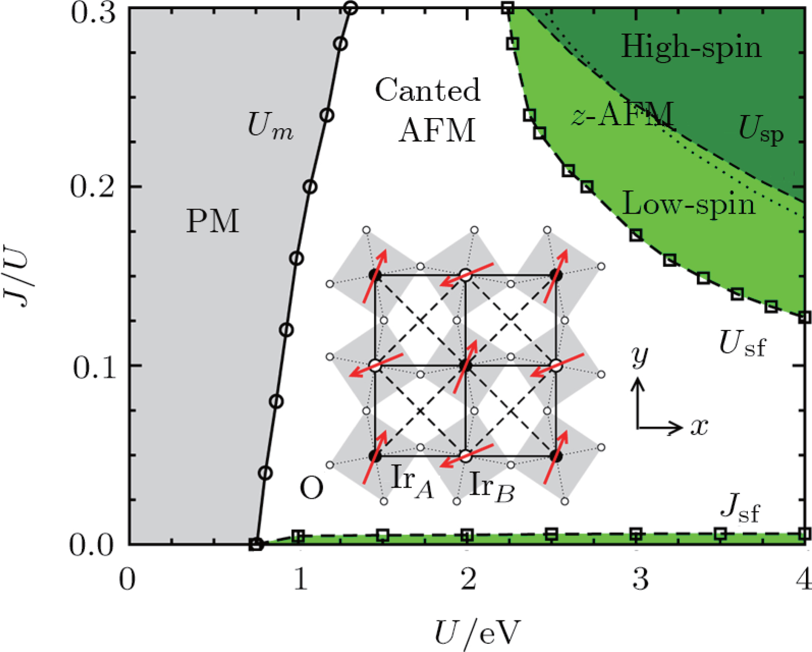 . The grey-shaded regime corresponds to the PM phase, the green-shaded area denotes the collinear z-AFM phase, and the rest unshaded regime is for the in-plane canted AFM phase. The dashed line separating the light-green and dark-green shaded areas indicates a spin-state transition from low-spin state to high-spin state in the z-AFM phase, and the nearby dotted line corresponding to J = 0.73 eV. The inset shows the schematics of the in-plane canted AFM moments on the Ir square lattice with a two-dimensional rendering of the staggered IrO6 octahedral rotation.