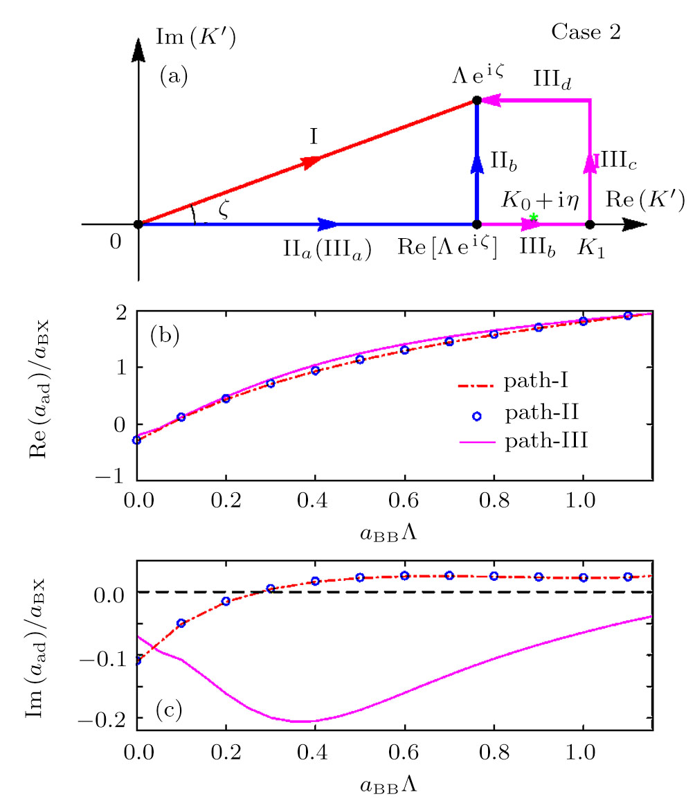 (Color online) (a) Typical integration paths for case 2; (b) and (c): Re[aad] and Im[aad] as functions of aBB, for the systems of case 2. The parameters are same as in Fig. 2. Here we show the results given by path-I (red dashed-dotted line), path-II (blue open circles), and path-III (magenta solid line).