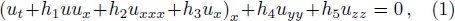where u=u(x,y,z,t), hi (i = 1,. . .,5) arbitrary constants. Equation (1) was first proposed in Ref. [32]. By taking some appropriate parameter values for hi, we can construct a variety of nonlinear wave equations. For instance, if we choose the coefficients h1 = −6, h2 = 1, h3 = 0, h4 = h5 = 3, Eq. (1) can be changed to the (3+1)-dimensional KP equation[33]