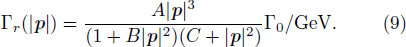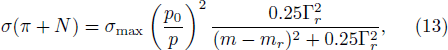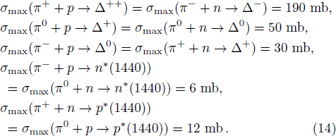 The pion is generated through the decay of resonances Δ and N*(1440). The spectral function of resonances is obtained by a modified Breit-Wigner function:[25]