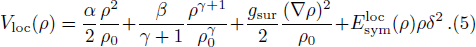 The parameters α, β, γ, and ρ0 are taken as −390 MeV, 320 MeV, 1.14, and 0.16 fm−3, respectively, and the corresponding compressibility is 200 MeV. gsur is taken as 130 MeV⋅fm5 and δ is the isospin asymmetry.