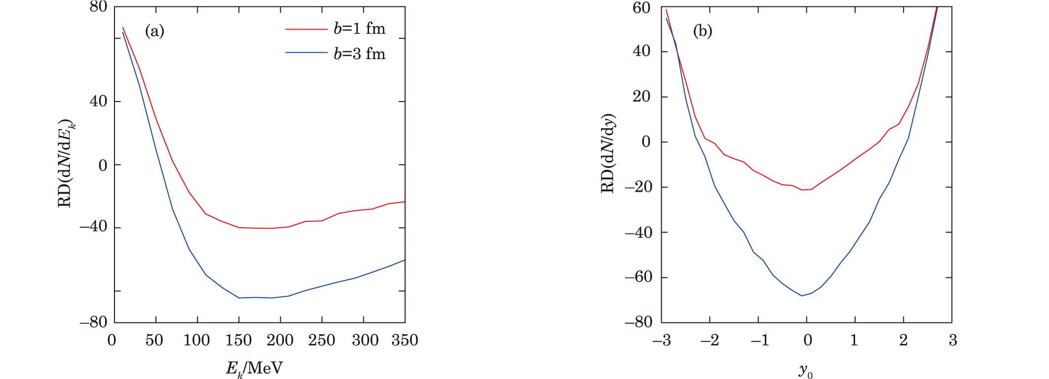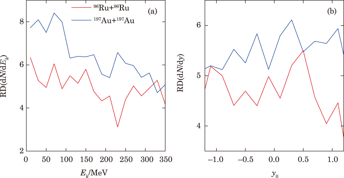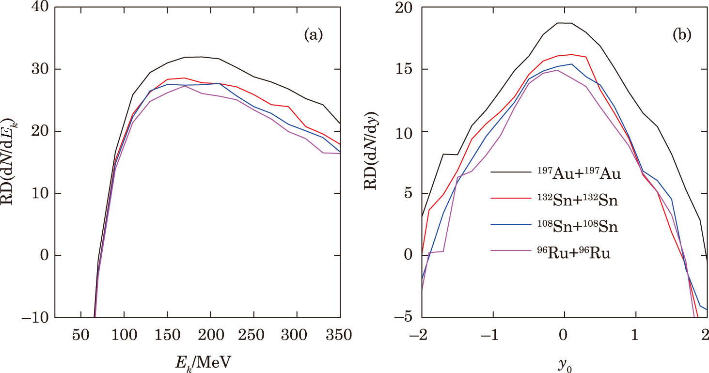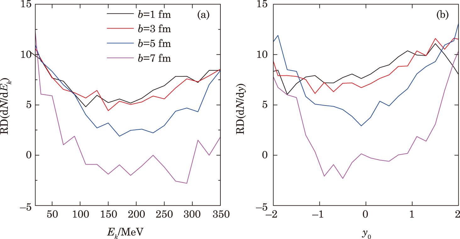 | Fig. 3 Impacts of the reaction NΔ → NN on the kinetic energy (a) and rapidity (b) spectra of π0 produced in 132Sn + 124Sn collisions at 1000 MeV/nucleon with b = (1, 3, 5, and 7) fm. |