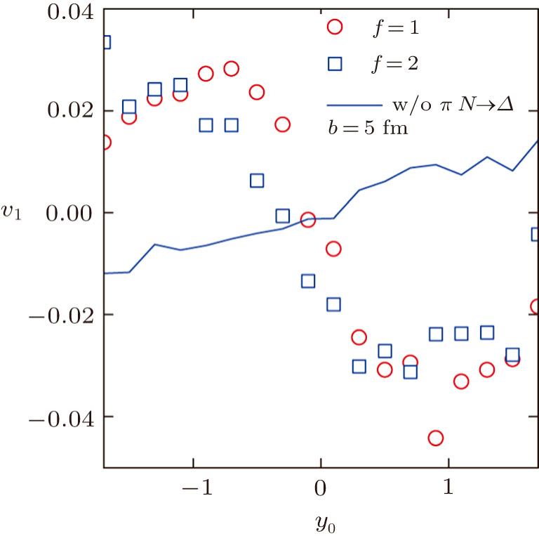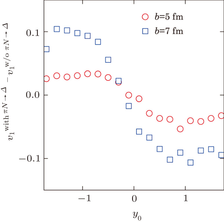 | Fig. 7 Impacts of the reaction πN → Δ on the rapidity spectra of the directed flow for π0 produced in 132Sn + 124Sn collisions at 1000 MeV/nucleon with b = 5 fm and 7 fm. |