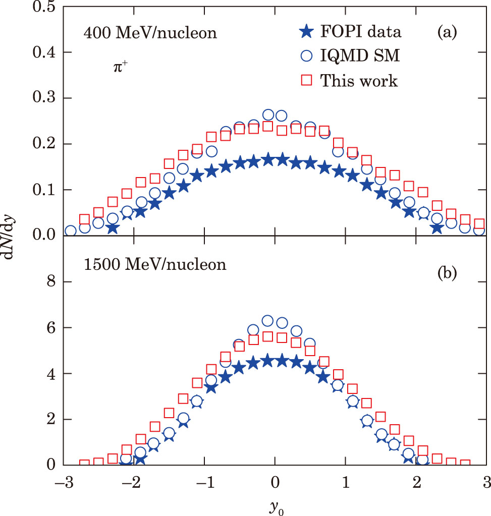 | Fig. 1 Rapidity distributions of π+ produced in Au+Au collisions at 400 (a) and 1500 MeV/nucleon (b). The FOPI data and the IQMD SM results are taken from Ref. [18]. |