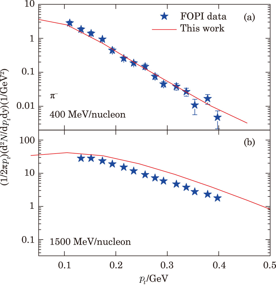 The EOS of nuclear matter at density ρ can be written as E(ρ,δ) = E(ρ,δ = 0) + Esym(ρ)δ2 + O(δ4) in terms of δ = (ρn − ρp/ρ) with ρ, ρn, and ρp representing the total, neutron, and proton densities, respectively. Until now the EOS of the isospin symmetric part E(ρ,δ = 0) is constrained quite acceptably,[49] but the EOS of isospin asymmetric nuclear matter, namely the Esym(ρ), is not yet constrained. In the past decades, a lot of probes to the Esym(ρ) have been found. Among them, the ratios of π−/π+ is one of the most controversial probes. Many inconsistent results have been obtained by comparing the theoretical simulations to the experimental data taken by the FOPI collaboration for pion production.[31–34]The in-depth understanding about the pion production mechanisms and the more precise experimental data on the pion production are required.