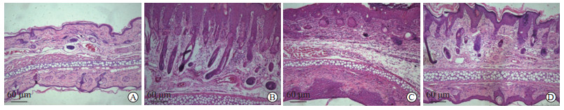 与正常组的鼠耳厚度[(0.24±0.02)mm]相比,模型组的鼠耳厚度增厚[(0.69±0.02)mm,P<0.01],皮下间质内大量腺体增生,可见数量较多的炎症细胞浸润,毛囊口扩大、角化明显,血管扩张。甲烷治疗组和视黄酸治疗组的鼠耳厚度[分别为(0.35±0.02)、(0.34±0.02)mm]较正常组略微增厚,但较模型组变薄(均P<0.01),两组之间鼠耳厚度差异无统计学意义(P>0.05);在腺体增生、炎症细胞浸润方面,两组鼠耳较正常组略多,但较模型组明显减少;在毛囊口扩大、角化及血管扩张方面,两组鼠耳较正常组略微明显,但对比模型组有较大改善。见图 2。