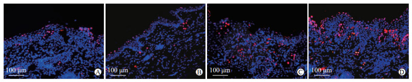 用3%戊巴比妥钠腹腔注射(0.2 mL/100 g)麻醉SD大鼠,用生理盐水经心脏灌流冲洗后,用4%多聚甲醛溶液进行内固定。切取鼠耳患处组织,4%多聚甲醛溶液外固定12 h。常规方法脱水至组织呈透明状,采用石蜡包埋,于切片机上切成约5 μm厚度切片。将鼠耳组织切片脱蜡至水,行H-E染色及TUNEL染色后分别在光学显微镜和倒置荧光显微镜下观察。