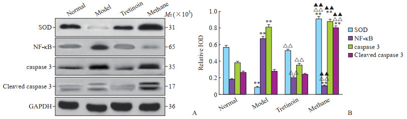 A: Western blotting image; B: Results of quantitative assessment. **P < 0.01 vs normal group; △△P < 0.01 vs model group; ▲▲P < 0.01 vs tretinoin group. n=3, x±s. SOD: Superoxide dismutase; NF-κB: Nuclear factor κB; caspase 3: Cysteine aspartic acid specific protease 3; GAPDH: Gyceraldehyde-3-phosphate dehydrogenase.
