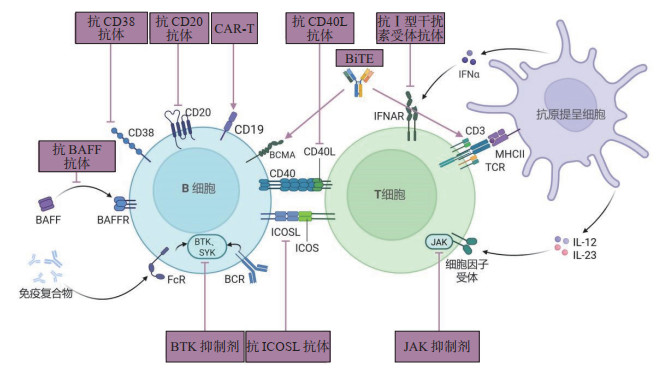 双特异性T细胞结合物(bispecific T cell engager,BiTE)是一类新兴的治疗药物,能同时结合T细胞和B细胞,激活T细胞并破坏目标B细胞。特立妥单抗是一种针对CD3和BCMA的BiTE抗体。在一项病例报告中,1例以活动性LN、自身免疫性溶血性贫血、多形性皮疹和多关节炎为表现的女性SLE患者接受特立妥单抗治疗后,随访观察显示患者尿蛋白/肌酐比值下降(<500 mg/g),血红蛋白水平上升,抗球蛋白试验在第4周转为阴性,并在随访期间保持阴性;抗双链DNA抗体水平迅速下降至正常范围,并在第16周仍无法检测到;补体水平和Ⅰ型干扰素活性正常化;特立妥单抗治疗导致外周血B细胞迅速耗竭,以及骨髓中的浆细胞和B细胞大量清除。该病例表明,短期的特立妥单抗治疗通过耗竭长寿命浆细胞和记忆B细胞迅速且无需药物地诱导SLE完全缓解。抗BiTE抗体可能成为一种未来的治疗选择,其反应率可能与抗CD19 CAR-T细胞疗法相似[70]。